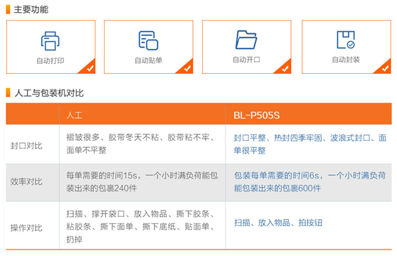 P500S系列自動發(fā)貨包裝機,具有以下功能特點:智能對接主流ERP,實時打印面單、自動貼標,可杜絕人工包裝的錯誤;能自動開袋,無需人工操作,提高包裝